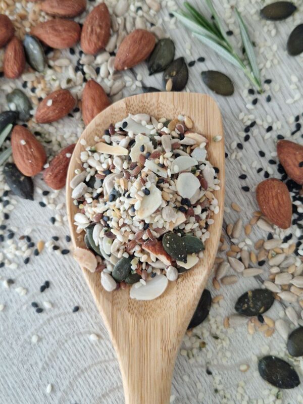 Sunflower seeds (21.0%), pumpkin seeds (13.0%), golden flaxseed (13.0%), brown flaxseed (12.0%), white sesame seeds (12.0%), hemp seeds (8.0%), black sesame seeds (8.0%), almond flakes (6.5%), chopped almonds with salt and rosemary (almond, salt, rosemary) (6.5%).